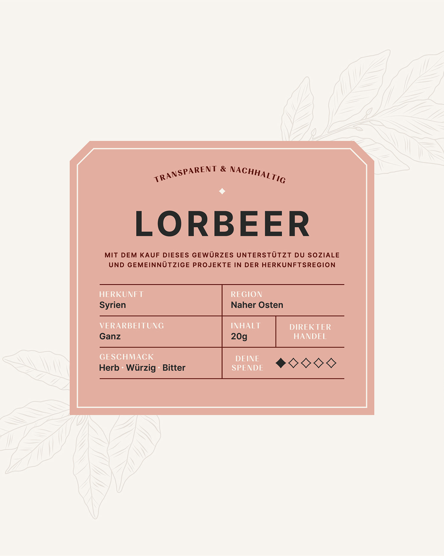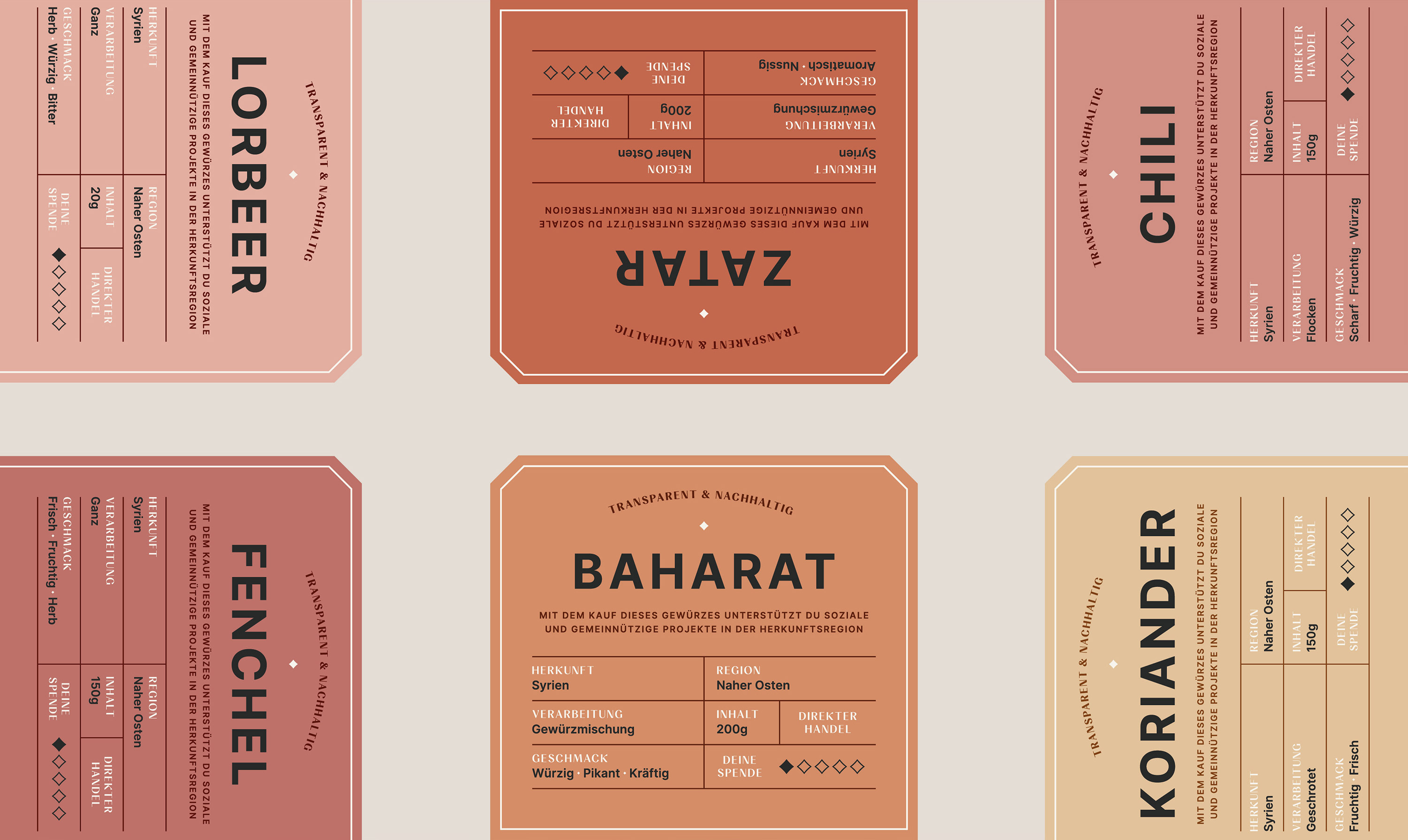 天然產(chǎn)品、與公平條件的個(gè)人接觸、可持續(xù)的包裝解決方案和透明的捐贈(zèng)出版物——帶著這一使命,兩位創(chuàng)始人 Felix 和 Rami 希望提高對(duì)食品行業(yè)不滿的認(rèn)識(shí)并重新建立公平貿(mào)易。此外,每售出一次產(chǎn)品,就有20%的營(yíng)業(yè)額流入原產(chǎn)地的社會(huì)項(xiàng)目,以直接幫助現(xiàn)場(chǎng)和支持人民。該項(xiàng)目以來(lái)自敘利亞的 8 種香料開(kāi)始:孜然、茴香、辣椒粉、辣椒、香菜、巴哈拉特、扎塔爾和月桂葉。