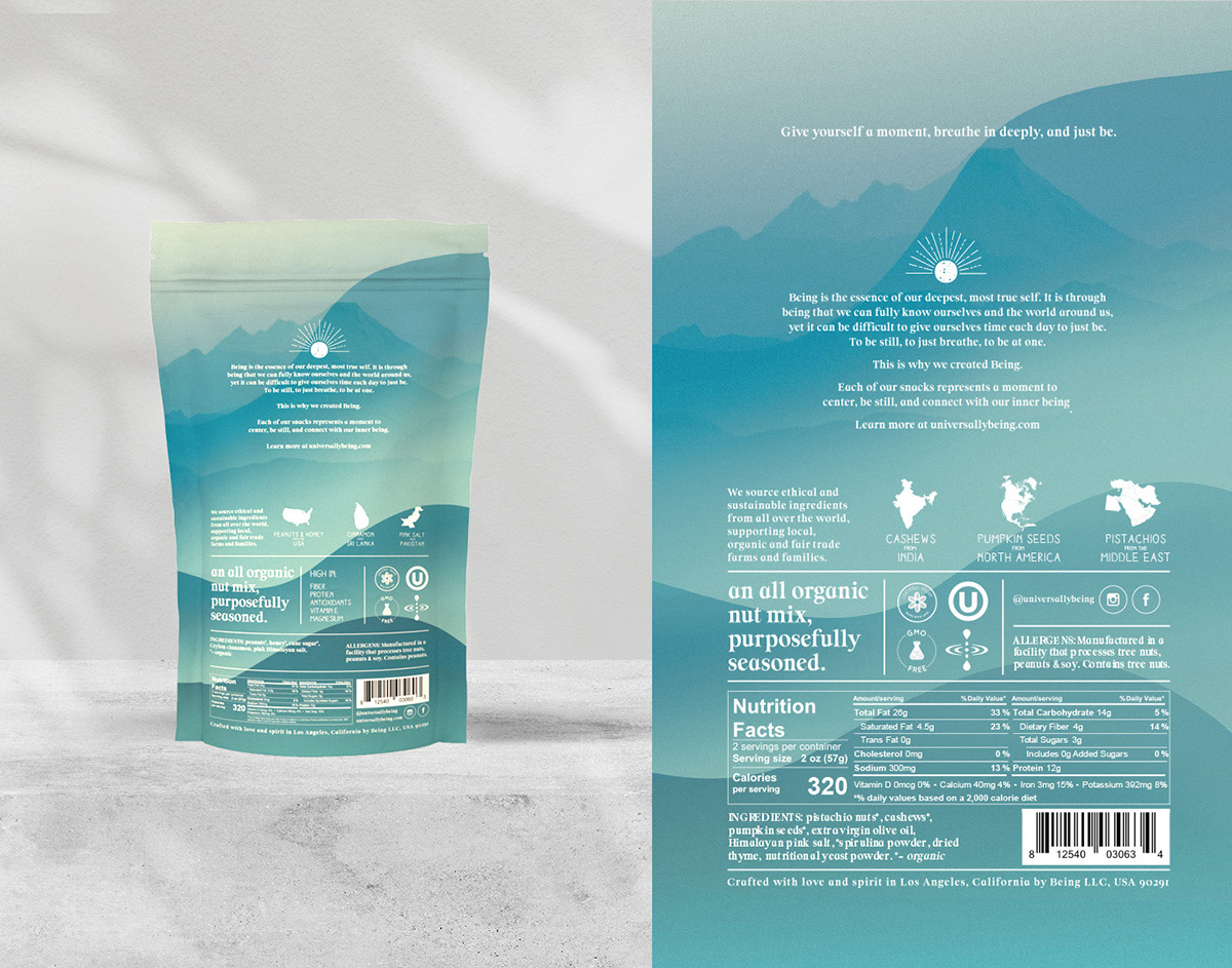 極簡主義:查看市場和類別,我們發(fā)現(xiàn)很少有產(chǎn)品在調(diào)味混合堅(jiān)果領(lǐng)域競爭,并希望整個(gè)包裝都能反映出這不是您常用的堅(jiān)果類零食。我們的目標(biāo)是讓人賞心悅目,讓心靈平靜,只提供完美代表產(chǎn)品本身的基本信息:沒有添加劑,沒有炒作,只有來自大自然的基本成分。
